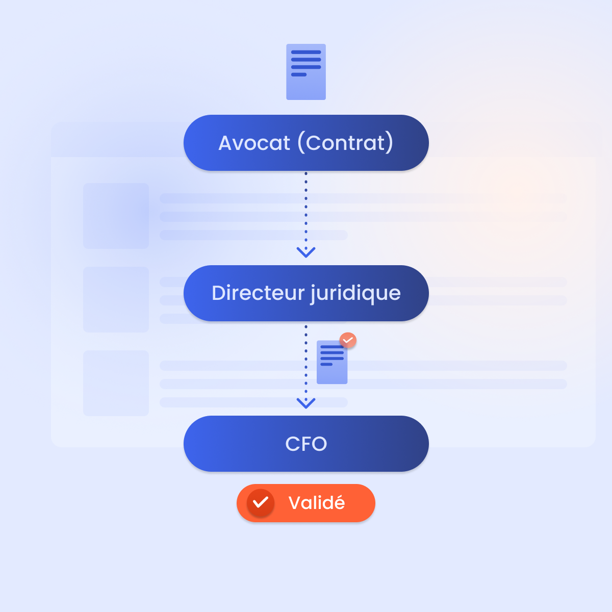 Accélérez vos circuits de validation grâce à des workflows automatisés et configurables selon le type de contrat, son montant ou votre matrice d’autorité interne. Définissez des règles d’approbation adaptées par catégorie de contrat ou par équipe, pour un traitement plus rapide, conforme et transparent. Conservez à tout moment une visibilité complète sur l’état d’avancement de vos dossiers.