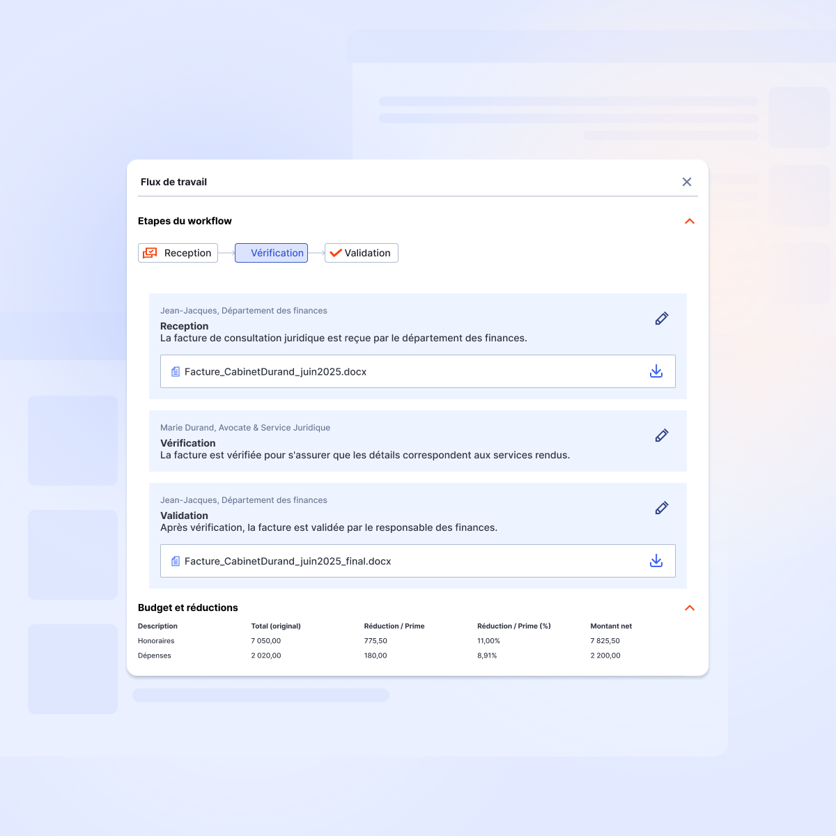 Assurez la fiabilité des informations grâce à des flux de travail automatisés pour la validation des factures et le suivi des honoraires. Cette approche permet de tendre vers une automatisation complète des processus de facturation et de comptabilité, offrant un contrôle budgétaire plus fiable et performant.