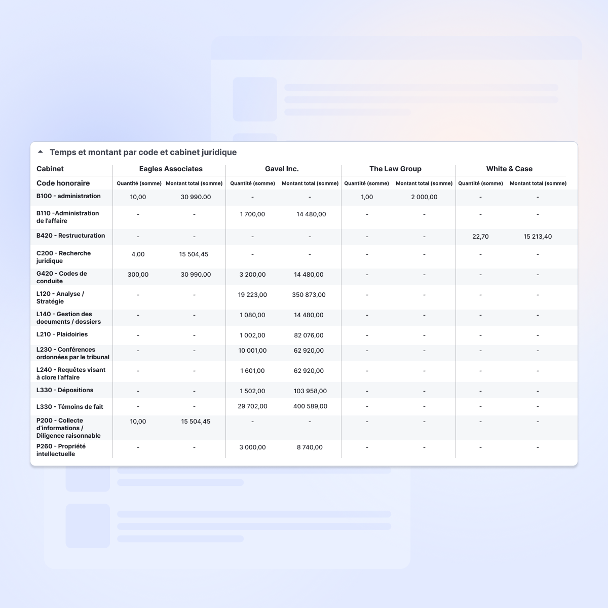 Réduisez le temps consacré au traitement des factures et simplifiez la gestion de vos tâches liées aux dépenses juridiques. Les informations issues de sources variées sont transformées en données uniformes et intégrées de façon fluide à vos systèmes financiers, facilitant ainsi un suivi plus efficace et structuré.