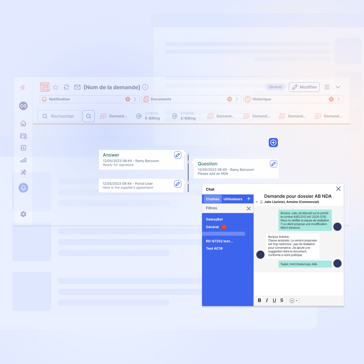 Centralisez l’ensemble des informations juridiques de votre organisation dans un point d’accès unique. Stockez et partagez vos données sensibles dans un environnement collaboratif et sécurisé, tout en conservant un historique exhaustif des communications, demandes et documents échangés via le portail.