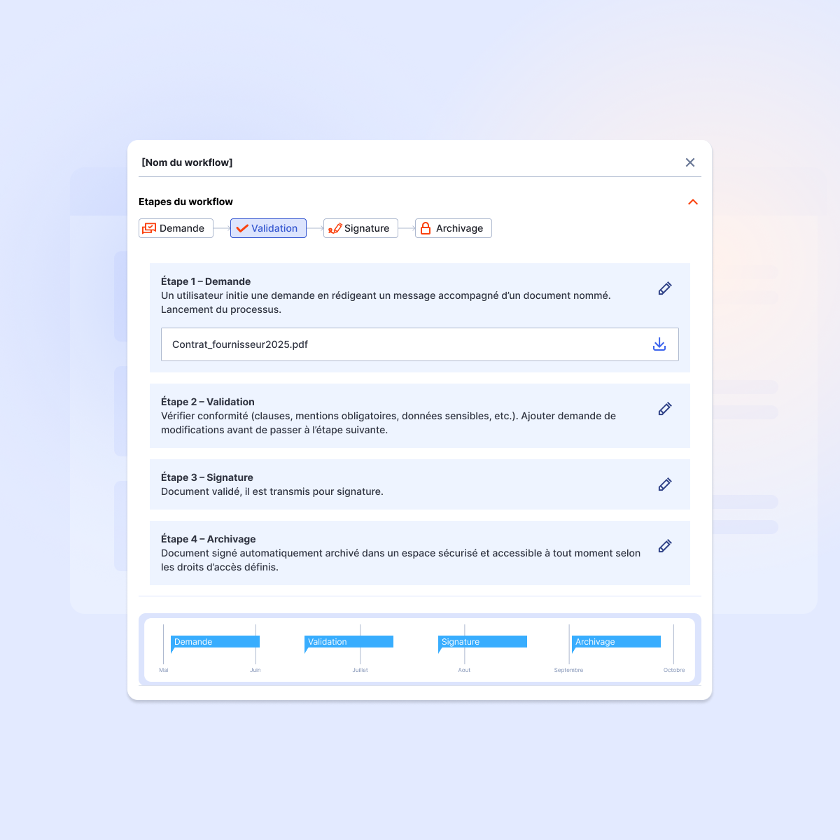Définissez des circuits de validation qui automatisent et simplifient vos processus. Accédez en permanence à la dernière version des documents pour garantir leur exactitude et éliminer les doublons. Suivez en temps réel l’avancement des dossiers et demandes, planifiez vos actions selon les échéances clés et assurez une organisation optimale de vos équipes.