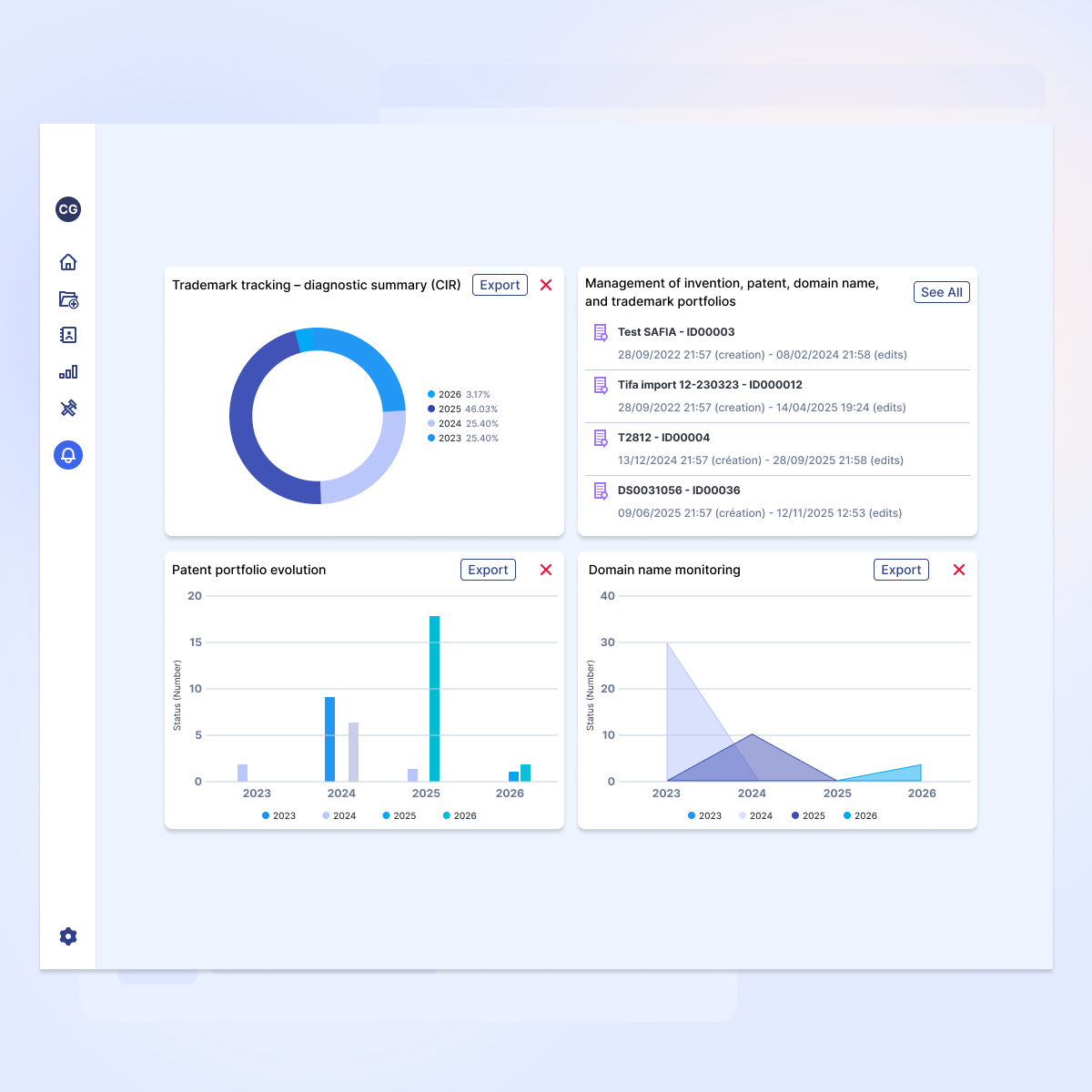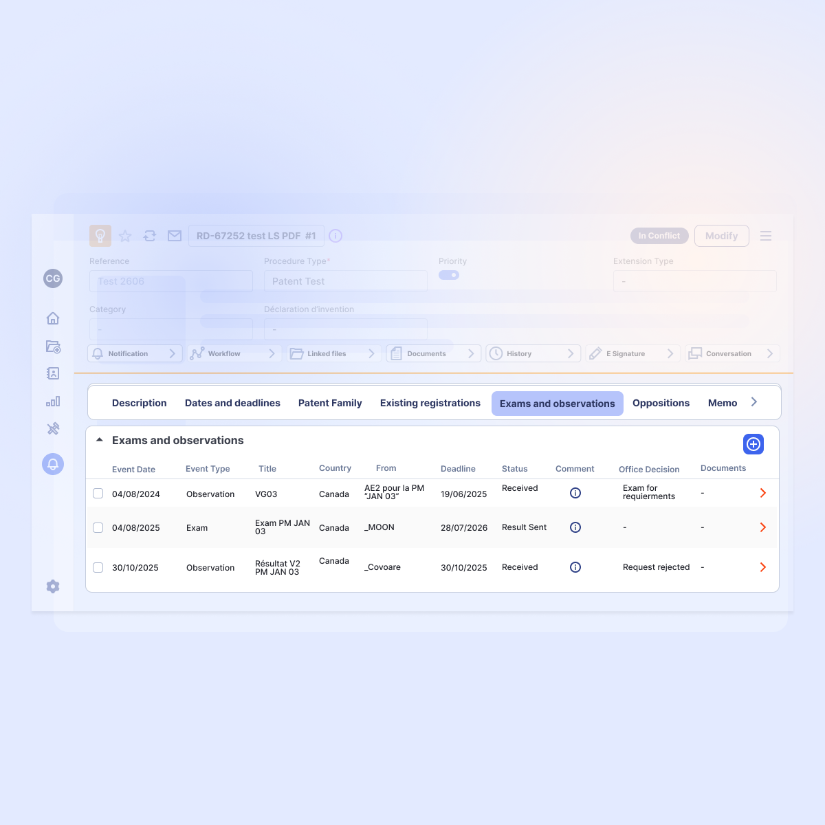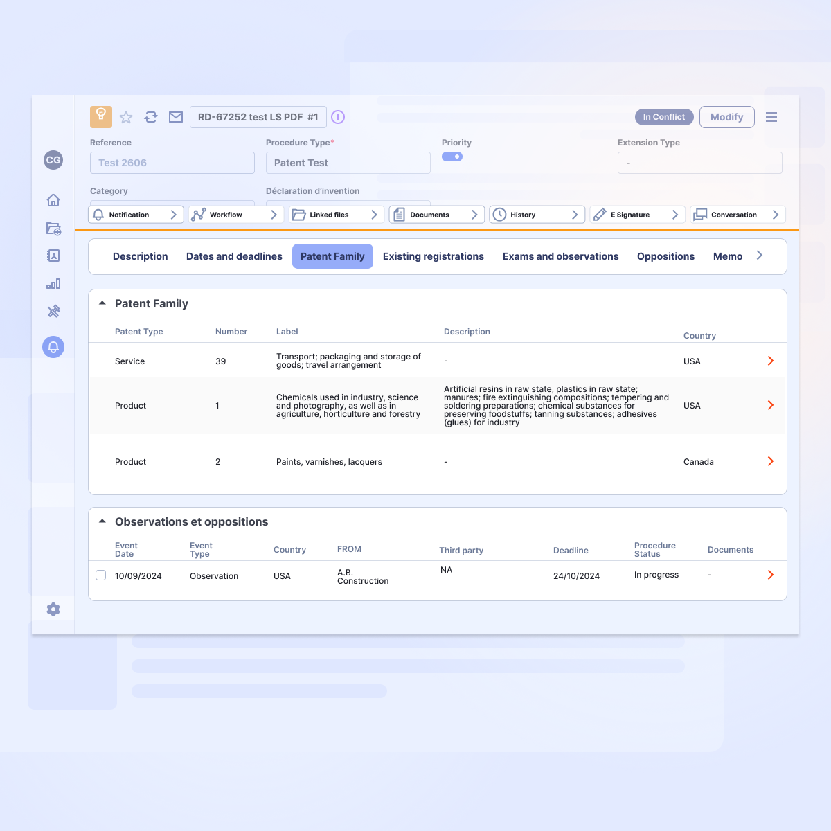 Manage your inventions, patents, trademarks, designs & models, and domain names from a single workspace. Each asset is linked to its stakeholders (inventors, owners, legal counsel, etc.), providing a complete and organized view of your portfolio to better anticipate deadlines and guide strategic decisions.