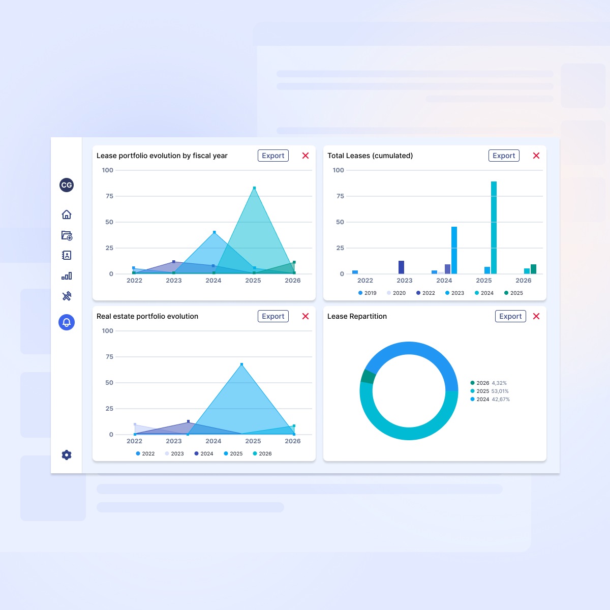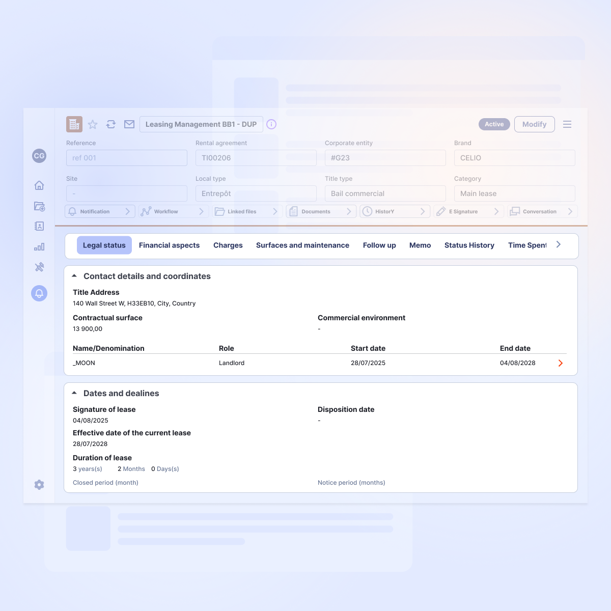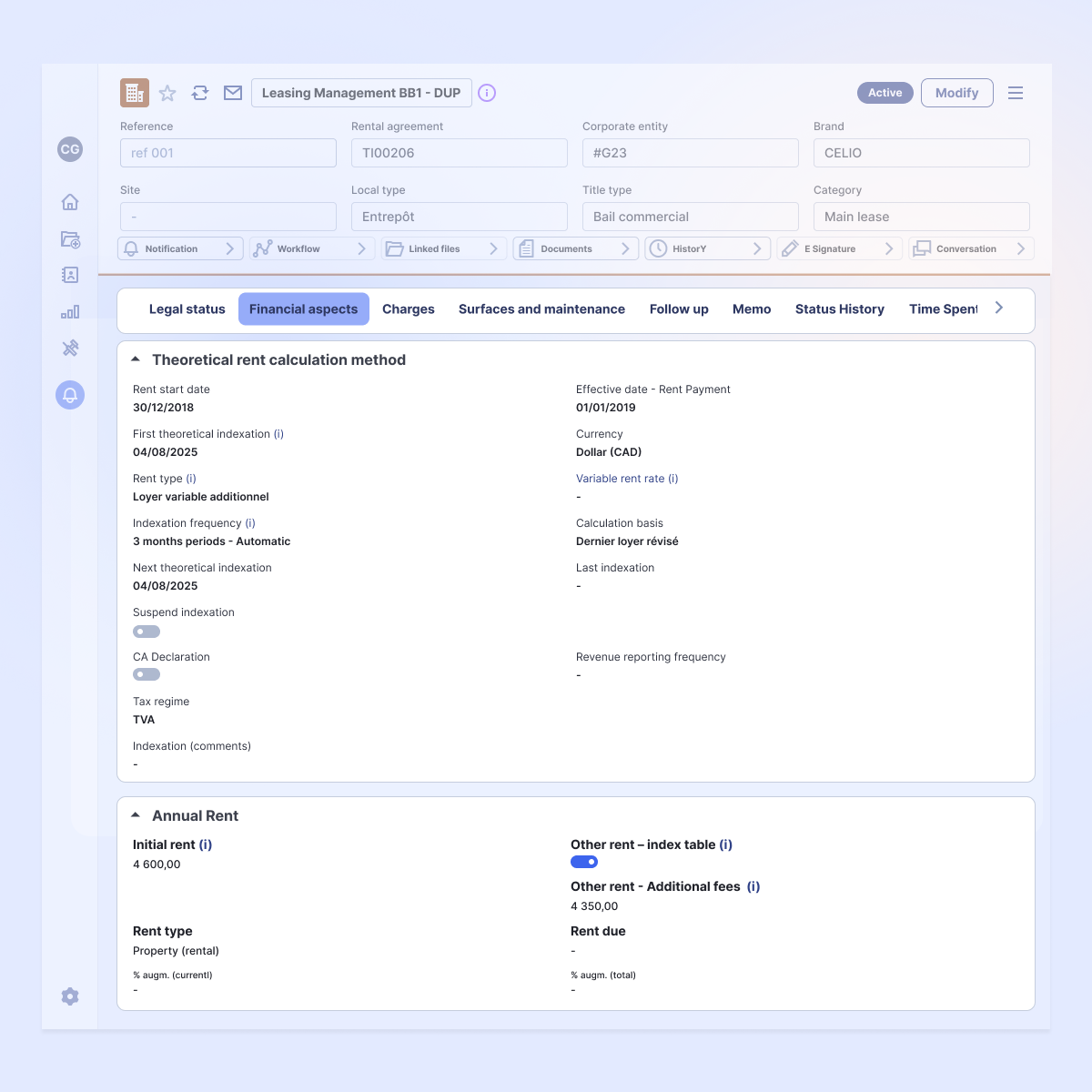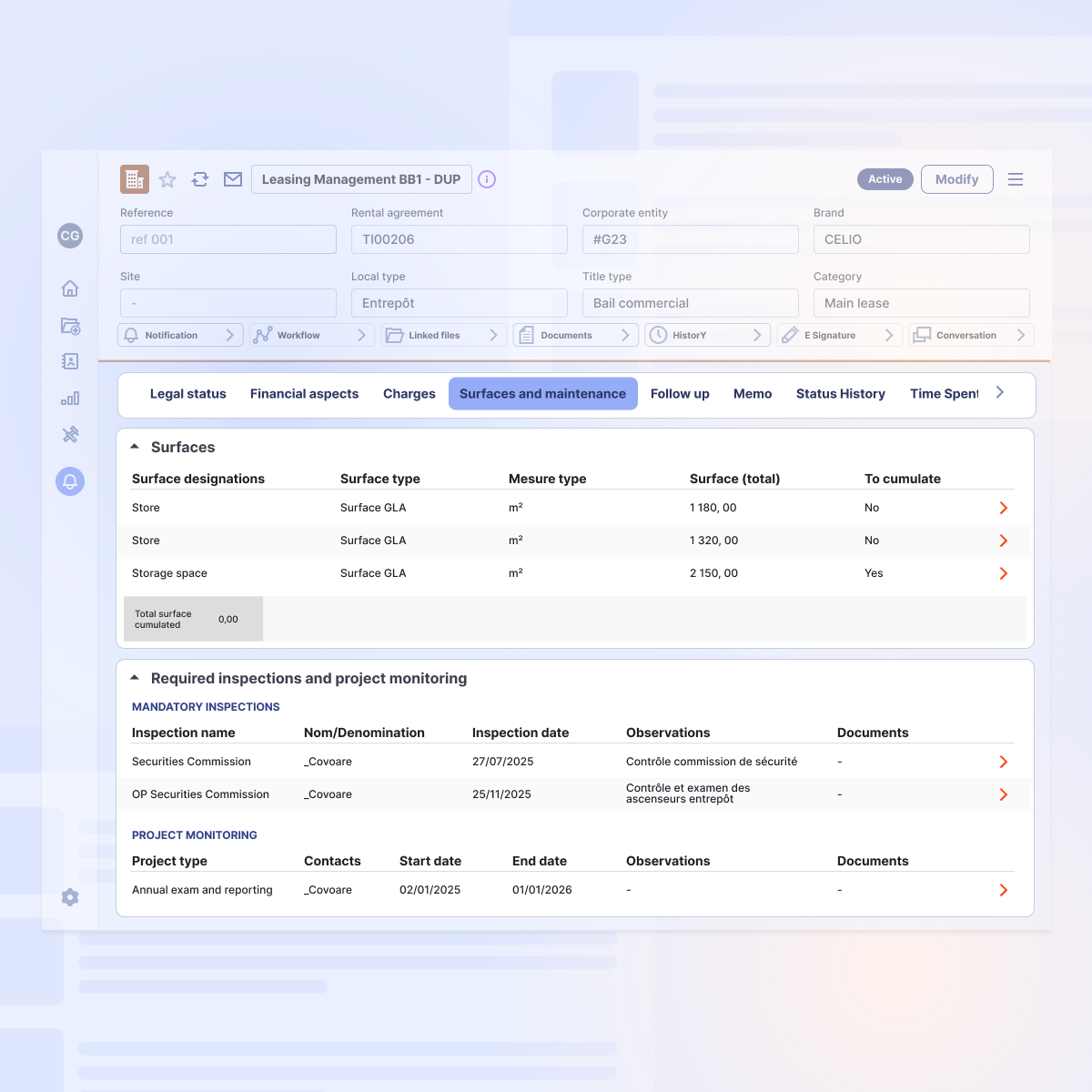 Manage the full financial scope of your contracts—fixed and variable rents, indexation periods, suspensions, security deposits, service charges, taxes, and fees. Obtain a clear, consolidated view to safeguard budgets, forecast accurately, and maintain full transparency over your real estate management.