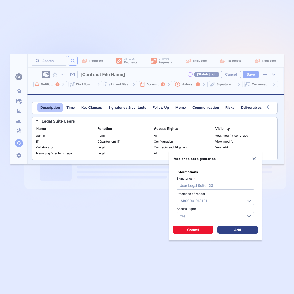 The Matter Management module centralizes and streamlines all of your legal activities. It simplifies matter tracking across all areas: contracts, litigation, intellectual property, and insurance—while improving traceability, risk management, and the operational efficiency of your legal department.