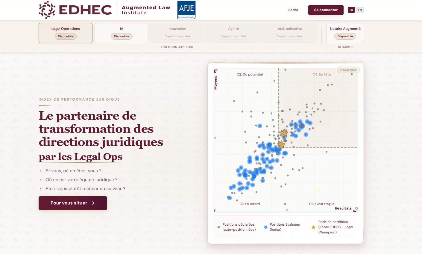 Dans un contexte marqué par l’IA, l’automatisation et les legal operations, les directions juridiques ont besoin d’outils concrets pour évaluer et orienter l’excellence de leurs pratiques. L’EDHEC Augmented Law Institute, avec le soutien de Septeo Legal Suite, a développé des index mesurant la performance des directions juridiques sur des axes clés. Ces index ont donné naissance à des radars de transformation, disponibles sur LegalPerformers.com/LegalChampion, qui permettent de se situer en temps réel, de prioriser les actions et de suivre les progrès dans la durée.