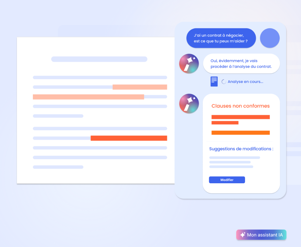Exploitez le Chat IA pour obtenir instantanément des réponses à toutes questions liées à vos dossiers juridiques. L’assistant analyse vos documents, extrait les données clés et identifie les risques ou non-conformités par rapport à votre politique interne. Il propose des modifications adaptées, automatise les tâches chronophages et renforce la valeur stratégique de vos équipes juridiques.